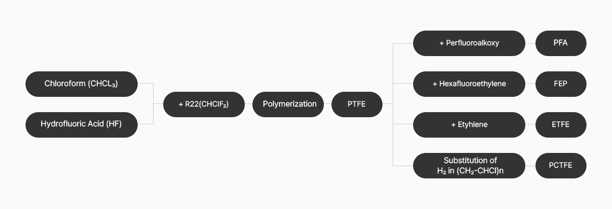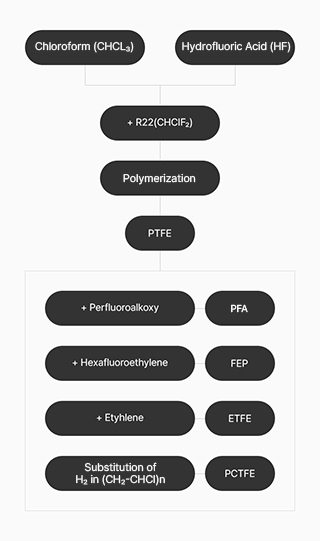 Fluoropolymer, like silicones, are made from ores. When an ore called fluorite is reacted with sulfuric acid (H2SO4), hydrofluoric acid (HF) is formed, and when various chemicals (chloroform) are reacted with this hydrofluoric acid (HF), gas is generated. The gas (R22) generated at this time is freon gas, which is commonly used in refrigerators and air conditioners.